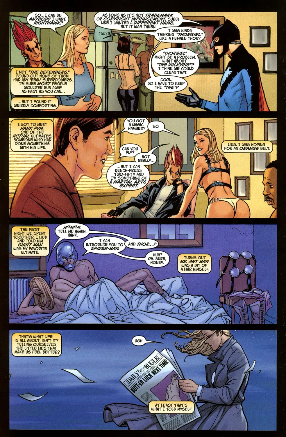 Барбара попадает в команду Defenders - обычных людей, одевающихся и ведущих себя как супергерои. Ее прозвище в команде - Девушка-Тор (Барбара - фанатка Тора, причем она обладает ярковыраженной нордической внешностью: рост 185 см, голубые глаза, светлые волосы). Когда к ним в команду приходит Хэнк Пим (бывший член команды Ultimates), Барбара заводит с ним кратковременные сексуальные отношения (Барбара питала слабость к супергероям).