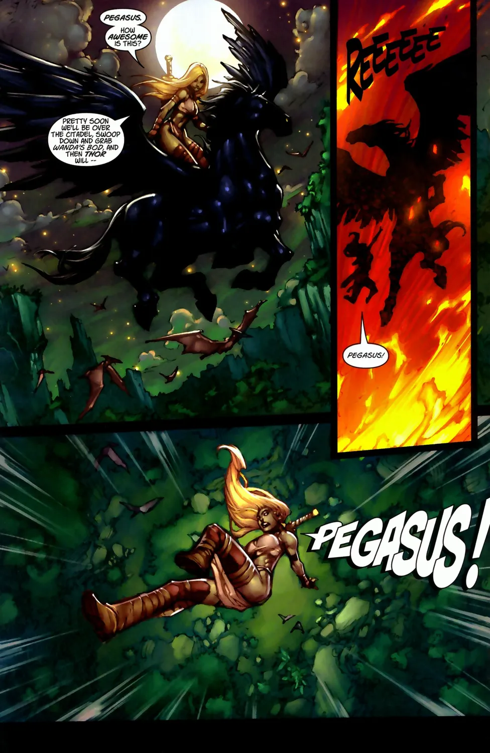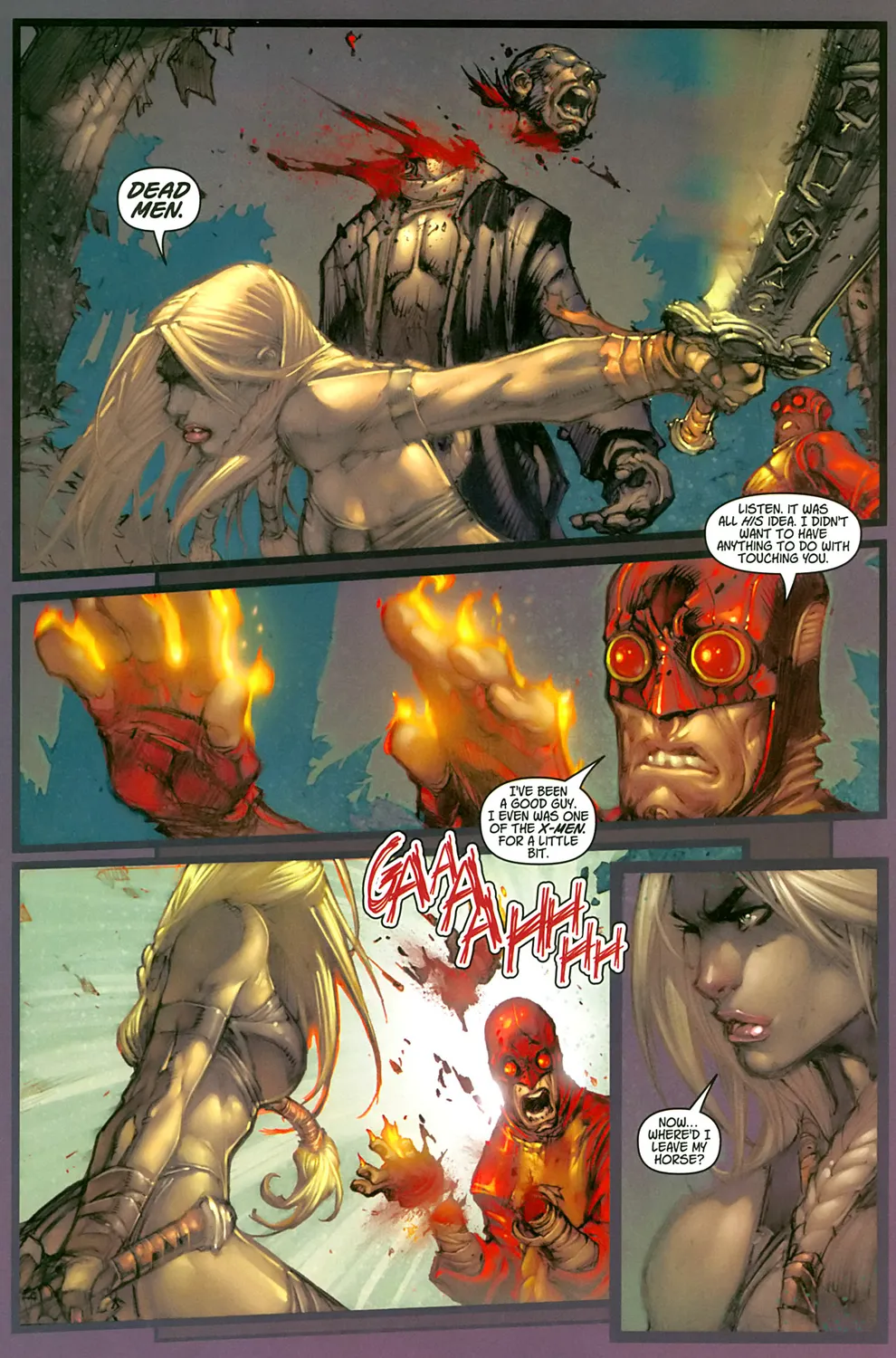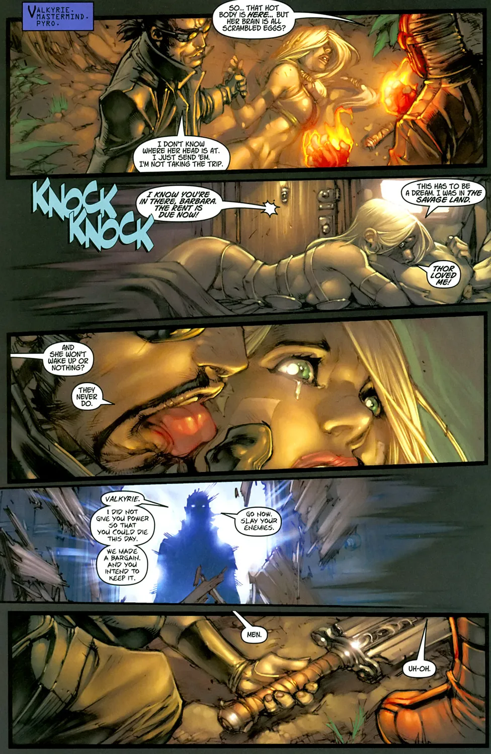 Во время выполнения задания, Пиро сбрасывает её с коня огненной атакой, Валькирия падает, и Мастермайнд создает в ее разуме ловушку-иллюзию. Пока она находится в бессознательном состоянии, Пиро пытается изнасиловать ее, но девушка неожиданно просыпается, отрубает голову Мастермайнду и расчленяет Пиро.