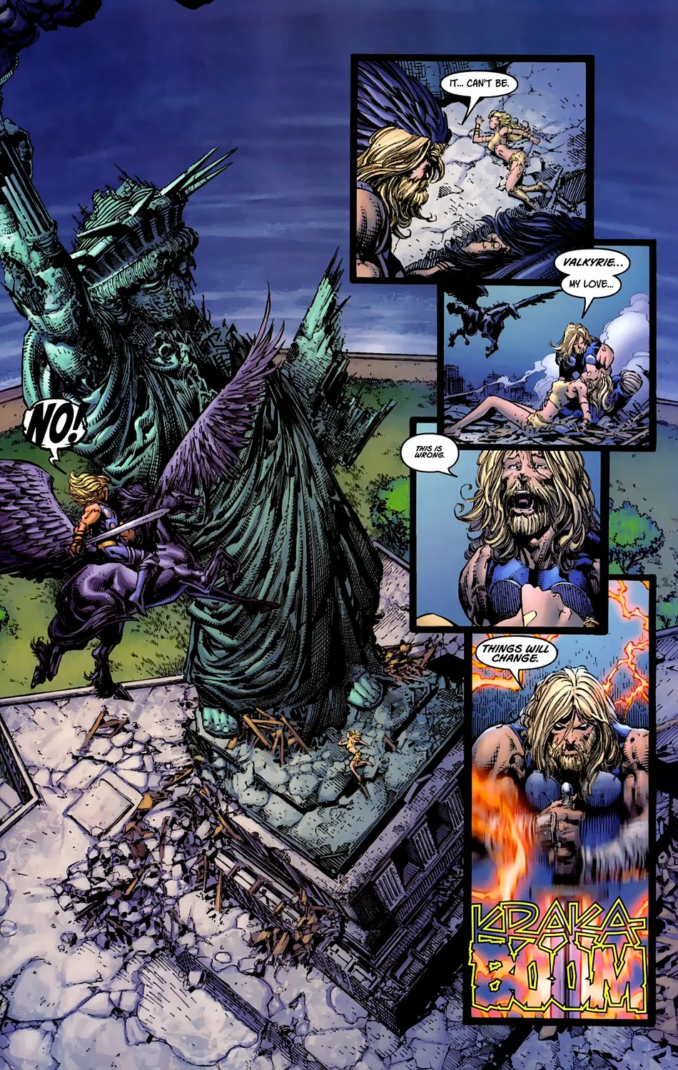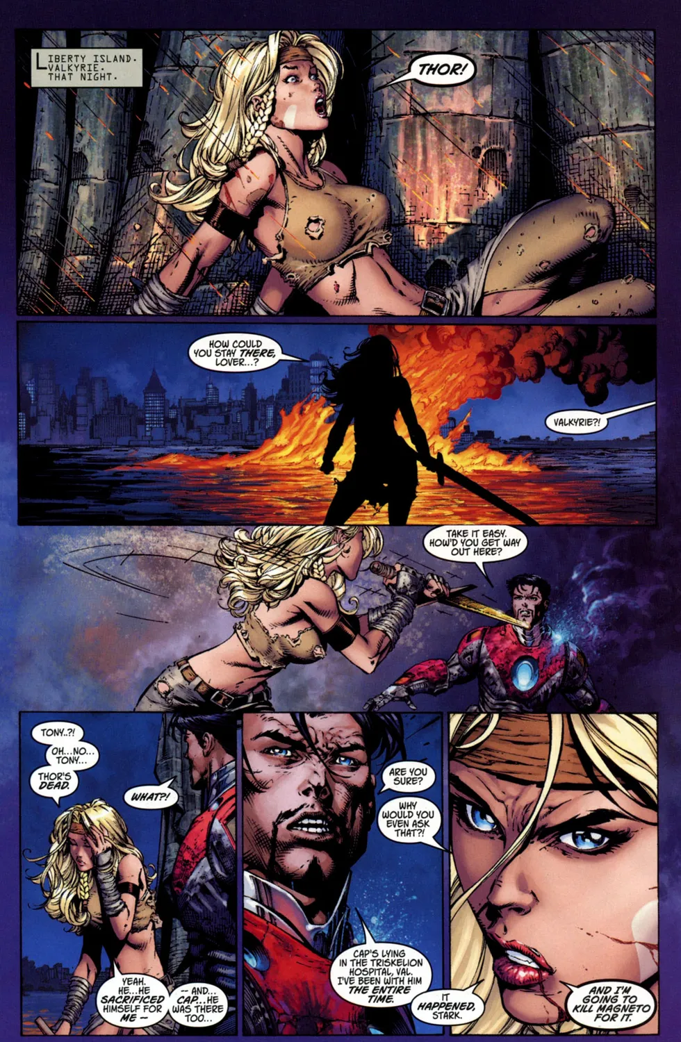Она соглашается в обмен на то, что Тор остается вместе с ней. Валькирия просыпается за пределами Нью-Йорка и пытается сообщить Железному Человеку о сложившейся ситуации. Ultimates начинают собирать супергероев со всего мира для борьбы с Магнето. Валькирия клянется убить Магнето за то, что он сделал.