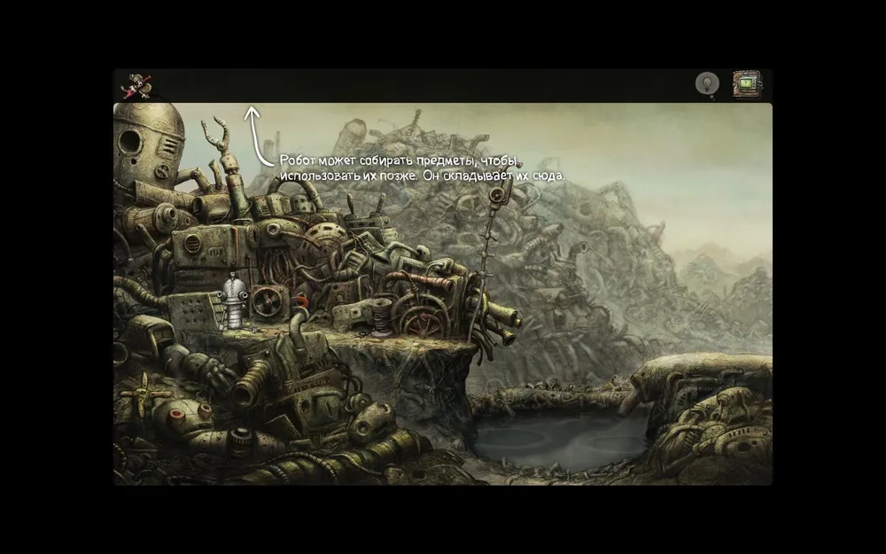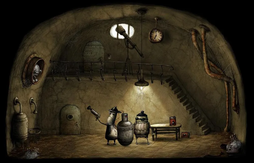 Ощущения нас не обманывают – стилистика игры именно такая. Но прежде чем говорить о ней, стоит сразу предупредить, это – инди-игра, говоря по-русски - не для всех. До Машинариума студия Якуба Дворского творила в своем, особенном жанре квеста. Сюжета там либо не было вообще, либо он был столь прост, что весь умещался во вступительном ролике. Игра состояла из набора локаций, цель каждой из которых – использовать предметы в правильном порядке, чтобы открыть путь дальше. Инвентаря не было, анимация была целиком сделана в Macromedia Flash… Но игры Amanita Design брали в плен своей атмосферностью. Это сложно объяснить, просто поиграйте в Samorost на официальном сайте, он бесплатный. Сразу прояснится много вопросов! Возвращаясь к Машинариуму, можно с уверенностью сказать, что та атмосфера есть и здесь.