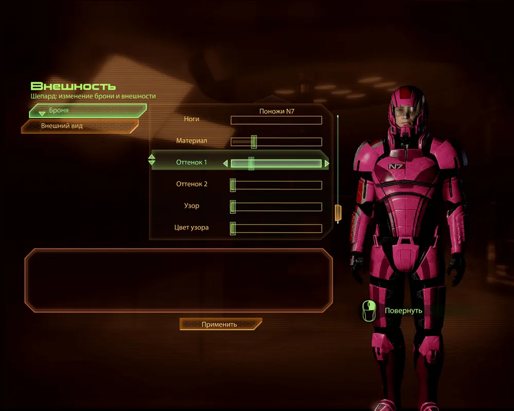 А вот броню теперь можно раскрашивать и настраивать по своему усмотрению. В специальном месте Шепард может подобрать себе светский костюмчик и наложить пару узорчиков на доспех.