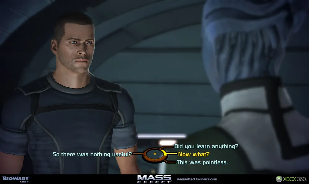 Именно в механике общения персонажей компания Bioware совершила прорыв, наконец-то внесяизменения в устоявшуюся диалоговую систему, которая раньше заставляла внимательно перечитывать все варианты ответов героя, на что уходила куча времени. Теперь мы выбираем лишь характер ответа, ориентируясь на короткие, емкие предложения. А дальше капитан Шепард сам разовьет тему, выдавая отлично поставленным голосом одну хлесткую фразу за другой, жестикулируя, играя мимическими мышцами. Именно поэтому Mass Effect во время диалогов превращается в интерактивный фильм, а мы лишь корректируем его развитие, с интересом наблюдая за разыгрываемыми сценами.