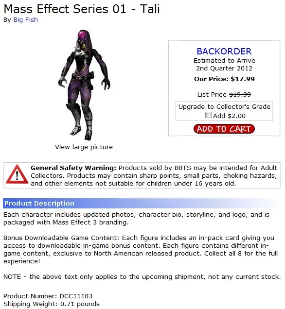 GameInformerсо ссылкой на BigBadToyStore.com сообщает, что каждая фигурка (о которых уже целый год идёт речь, сначала в блоге ME2, теперь в блоге МЕ3 - прим. автора) будет укомплектована кодом для активации дополнительного игрового контента (уникального для каждой персонажа). Соответственно, для полного удовольствия надо будет собрать все 8. Правда, это эксклюзивно для Северной Америки.
