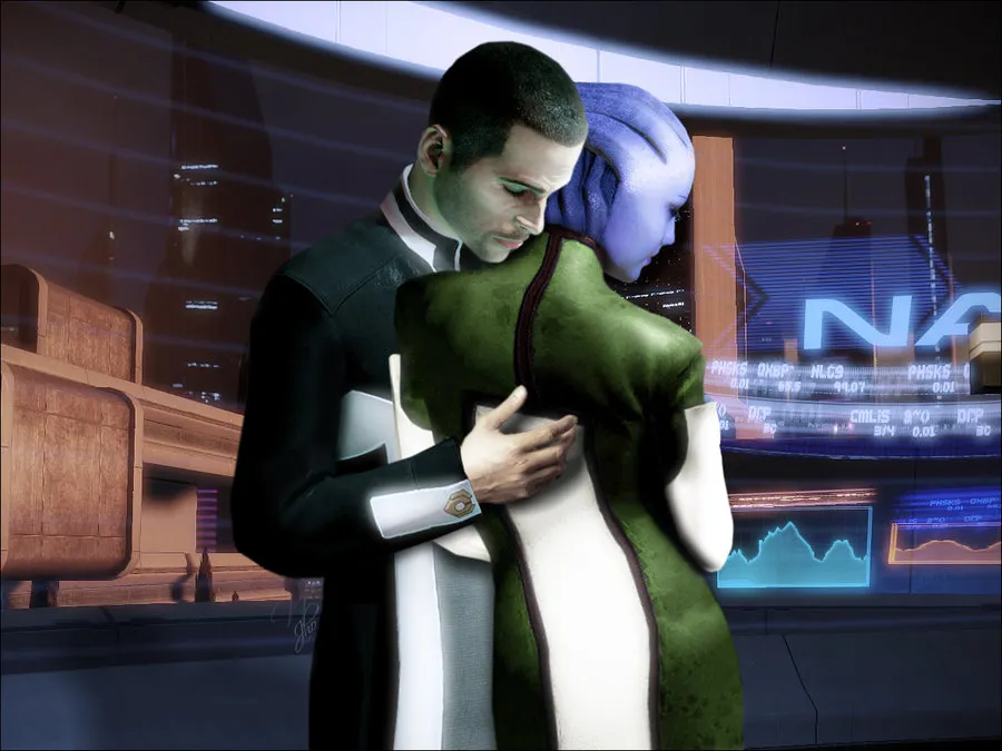 Когда Нормандию запирают на Цитадели, Лиара приходит поддержать капитана. Только Джокер помешал им в тот момент поцеловаться.