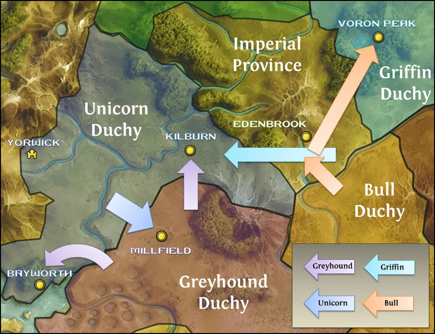 Осада Бэйворта, возглавлявшаяся Гарландом Чёрнокаменным, длилась 7 месяцев и завершилась провалом — защитники города смогли обеспечить себя продовольствием благодаря контрабандистам. Ровена же не смогла отбить Миллфилд. Когда же вести о том, что Гончая собирается напасть на Килбурн, дошли до Ивана, он помчался на восток, взяв с собой кавалерию и оставив командование основной армией Татьяне из Буреграда, известной также своим солдатам как Белая Львица. Может показаться безрассудным то, что Иван бросил часть своей армии, предоставив командование юстициару, но стоит вспомнить о том, что этот город был назван в честь странствующего рыцаря, как всё станет ясным.