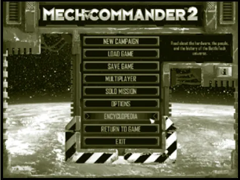 Игровое руководство по MechCommander 2 описывает основные функции главного меню, включая начало новой кампании, загрузку и сохранение игр, мультиплеер и настройки. Руководство также охватывает логистику, миссии, механгар, модификации мехов и лабораторию для улучшения оборудования, что поможет игрокам оптимизировать стратегию и подготовку к битвам.