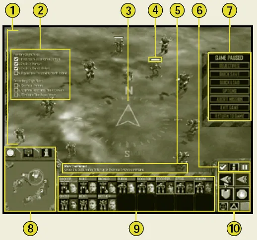 Вторая часть игрового руководства по MechCommander 2. Узнайте о боевом интерфейсе, включая управление десантной командой, цели миссии, тактическую карту и меню поддержки. Полезные советы по управлению и стратегическому взаимодействию в игре.