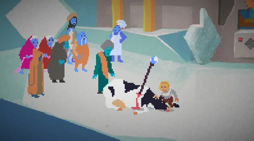 Бегите на луг, пройдите к тому месту, где вы обнаружили соляной камень. Поднимите с земли коровий колокольчик. Бегите скорее к озеру. Тонущую корову нужно спасти, трижды постучав колокольчиком о горизонтально расположенную привязь. Корова будет спасена! Вернитесь домой, бегите снова к лугу. Щёлкните ЛКМ по коровам, они будут похищены. Бегите вслед за кораблём.
