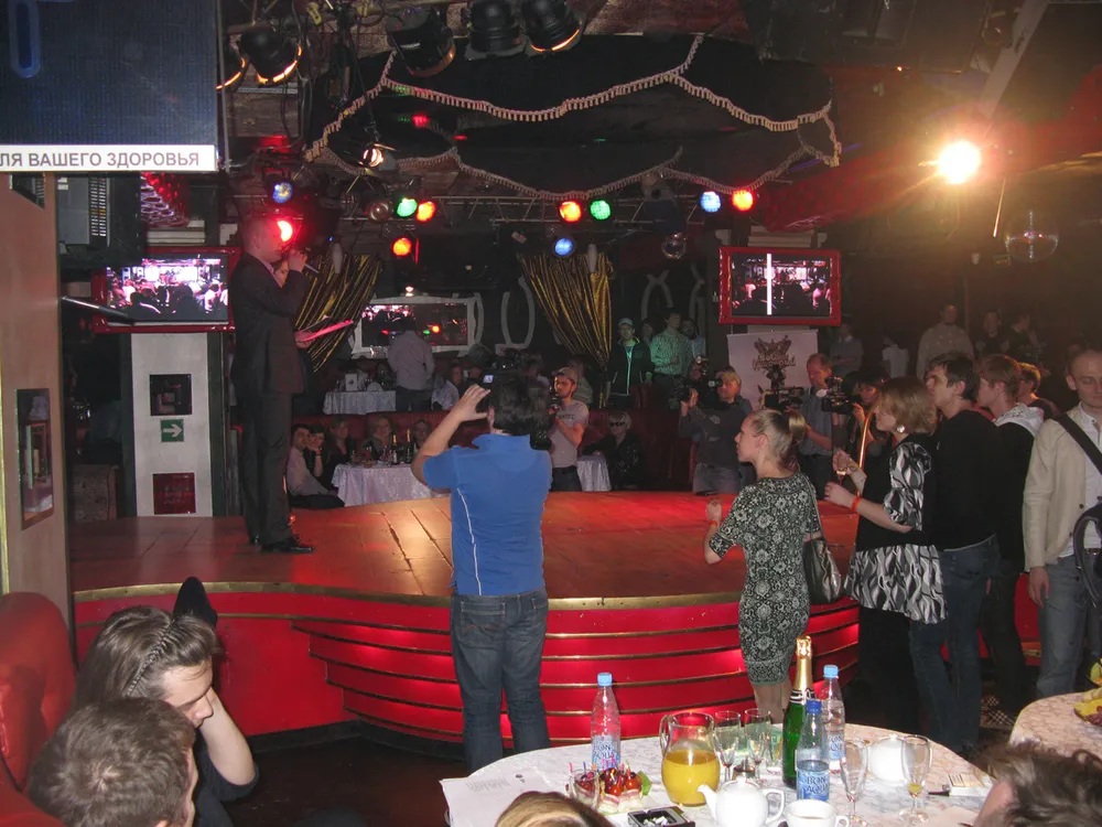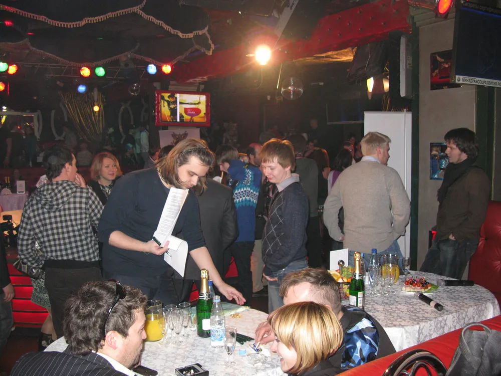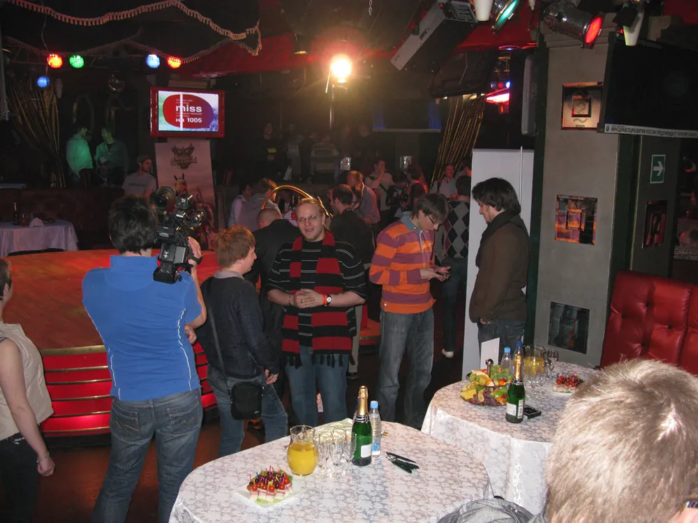 Короче, опоздав, но не опоздав, мы добрались до клуба и ринулись внутрь. Там все, как и положено: толкотня, давка, очереди. Понятно, что ничего не понятно. Разобраться, кто куда стоит, сразу не удалось, толпа умеет поразительно хорошо маскироваться, и понять, куда именно двигается ваша очередь, можно только минут через десять ожидания. По счастью, мы разобрались быстро. В толпе у гардероба была обнаружена Эвер, а чуть попозжа мы уже обзавелись браслетиками-проходками с номерами. Я была номер 3055. К слову, не могу не похвалить сотрудника со стороны организаторов, который громким голосом построил всю толпу на вход в три очереди. Ему бы это.. речи толкать на парадах. В общем, вот. Но вам это все неинтересно, давайте уже в клуб топать. Мы тоже так решили.. ну, и потопали. Встретили Свету, она нас сориентировала, куда идти, и мы отправились за наш общий столик.