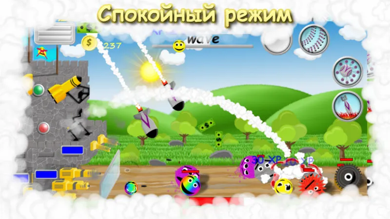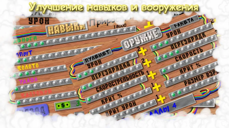 Основное вооружение (пулеметы и ракеты) можно прокачивать увеличивая урон, скорострельность, радиус поражения, скорость перезарядки, крит урон и т.д. Также есть небольшая прокачка навыков которые повышают приток денег, золота, опыта а также увеличивают удачу и здоровье замка.