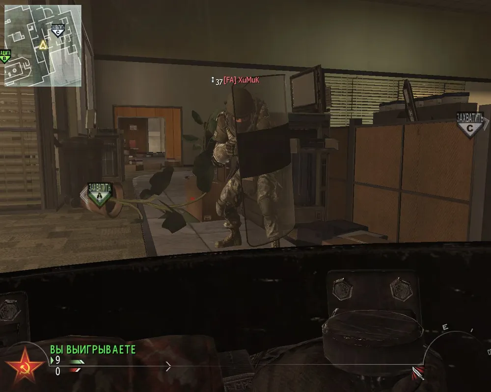Но иногда среди всей этой массы робко просовывается на свет парень в бронежилете и прозрачным щитом в руках. Как часто мы встречаем таких? Не особо, согласитесь. Хотя много раз я наблюдал такую ситуацию - стоит кому-то вытащить щит, и еще один-два игрока поменяют свой класс на полицейского. Да ради интереса, чего ж не разнообразить игру? В этом и заключается одно из преимуществ этого оружия - разнообразить геймплей. Действительно - не надо пользоваться кнопками мыши, обзор происходящего за прочным прозрачным материалом щита, привычный удар ножом... нет, теперь бьем дважды по врагу своим орудием. В этом, возможно, и заключалась задача infinity ward - добавить в игру еще одну необчную, но уместную изюминку. Так ведь интересней, правда? Но не надолго, и мы снова возращаемся к старым штурмовикам, снайперкам и т д и т п.