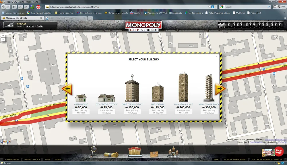 на данном скриншоте представлена свободная для покупки улица (так же вылезло предложение найти ближайшее здание оппонента и взорвать его:)
