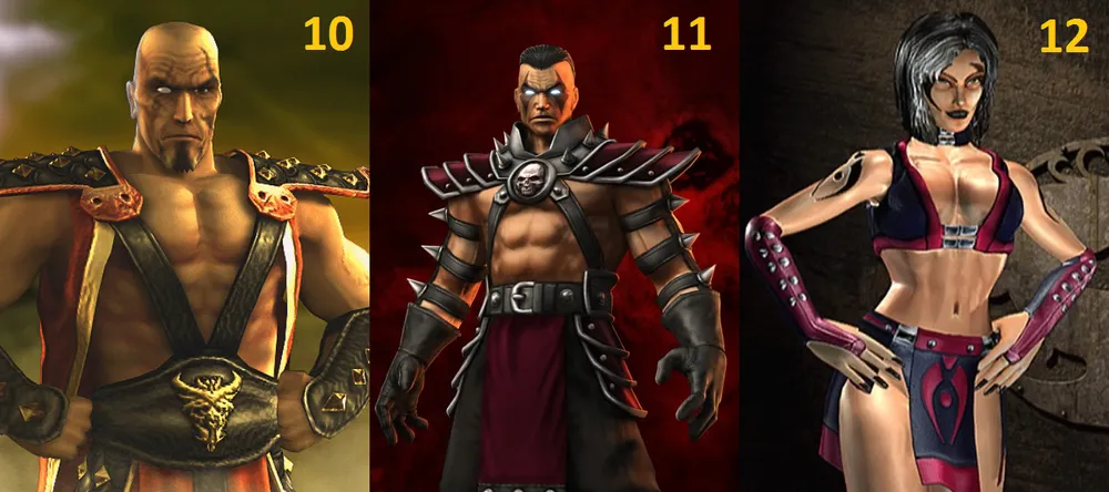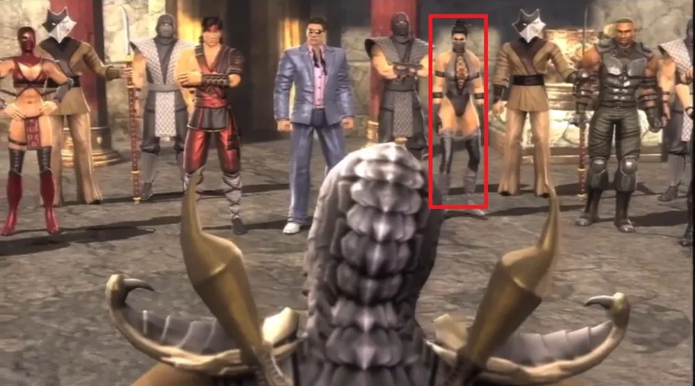 Один из главных антагонистов серии падший старший бог Шиннок (1) появляется в роликах в режиме истории. Впервые напоминание о нём игроки получают в самых первых кадрах. Его гигантские костяные руки держат тело мёртвого Кунг Лао. Затем Шиннока можно заметить в видениях Рэйдена. В самом конце режима истории падший бог является Куан Чи, из этой сцены игроки узнают, что все произошедшие события следовали согласно его плану. Также Шиннок появляется в аркадной концовке Куан Чи. В изначальном ролике также можно заметить тело поверженного Бо'Рай Чо (2) - учителя Лю Кенга, Сунджинко и Ли Мей. Позже его портрет проскальзывает в базе данных Кибер Саб-Зиро. Героя также можно увидеть в аркадных концовках Лю Кенга и Шан Цунга. Всё еще наблюдаем первую сцену, среди падших воинов находится генерал армии сейданов из Царства Порядка - Хотару (3).