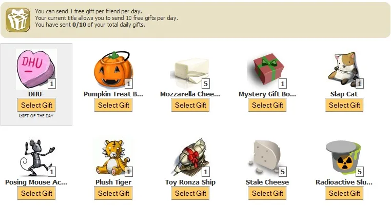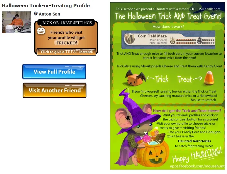 В зависимости от того, что вы выбрали (Розыгрыш или Угощение) ваш друг получит определенный вид сыра: Ghoulgonzola cheese за Розыгрыш (Trick) и Candy Corn cheese за Угощение (Treat). Когда вы заходите в профиль друга и он вас Разыгрывает/Угощает, вы получаете 6 кусочков сыра. За сутки можно получить не более 60 кусков сыра (можно посетить только 10 друзей).