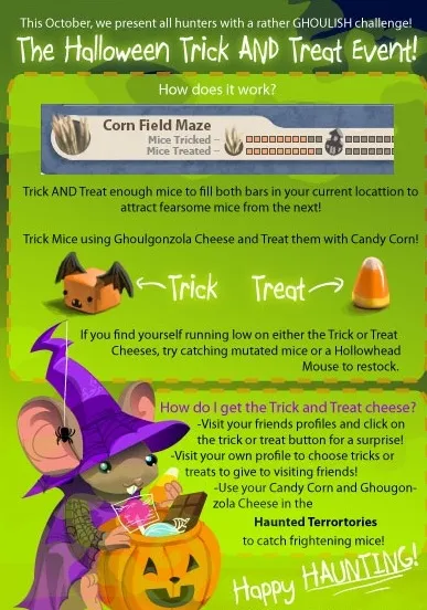 В Pumpkin Patch Вам необходимо поймать по 40 мышей на каждый вид сыра, при этом 40я мышь будет эвентовая: Treat (Candy Corn cheese) и Trick (Ghoulgonzola cheese).