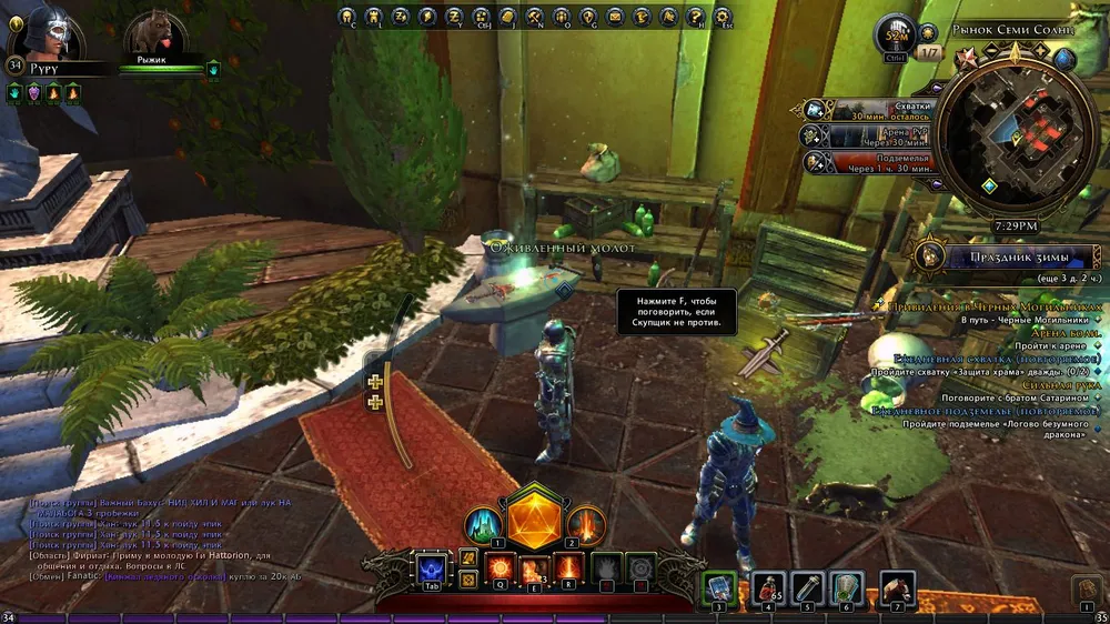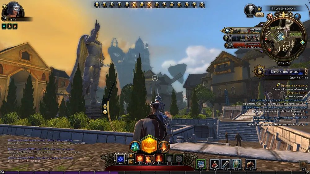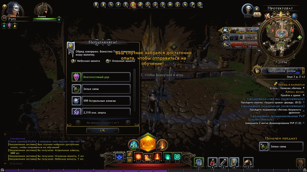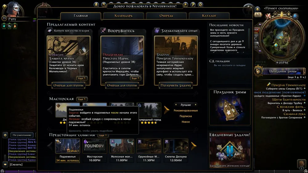 Каждый час дается бонус к какому-либо виду деятельности. То лишний сундук в крафте, то 150% репутации за ПвП. Рядом с миникартой показано расписание и текущий бонус, так что играть желательно в соответствии с расписанием. На каждую деятельность дается ежедневка с наградой в виде осколков кристалла, которые перерабатываются в промежуточную валюту (максимально 24000 в день). Видите, что сейчас бонус на подземелья - взяли ежедневку подземельную и пробежали его быстро.