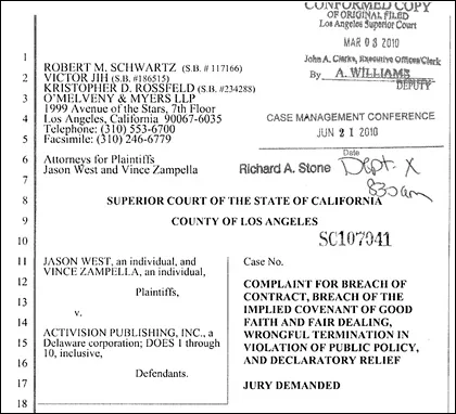 А теперь к сути. В среду мы узнали о скандале, в который втянуты неожиданно уволенные руководители студии Infinity и издательство Activision. По решению последнего, контракт с господами Зампеллой и Уэстом был прерван, в результате чего они лишились работы и процента от реализации недавнего шутера Modern Warfare 2 (MW2). Уволенные немедленно подали в суд на Activision.