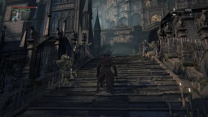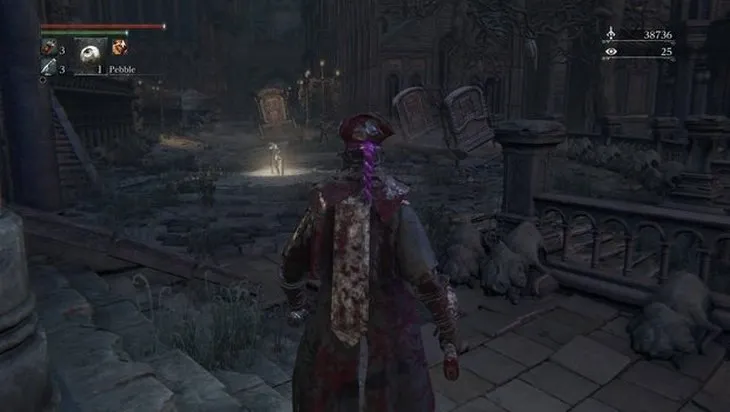 Выйдите через верхний выход от фонаря возле Собора (Cathedral Ward), поверните направо и следуйте по высоким ступенькам. По дороге вы встретите двух замаскированных врагов. Разберитесь с ними, затем поднимитесь на верх ступенек, чтобы найти щит.