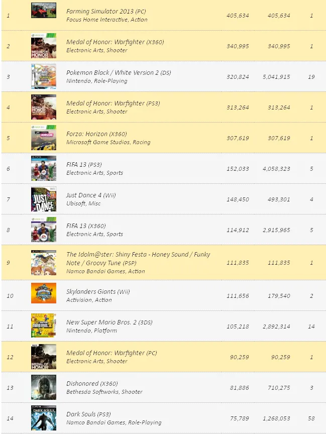 Первое место в топе продаж занял Farming Simulator 2013. Игра разошлась тиражом в 405 тыс. копий. Стоит отметить, что игра является эксклюзивом для персональных компьютеров.