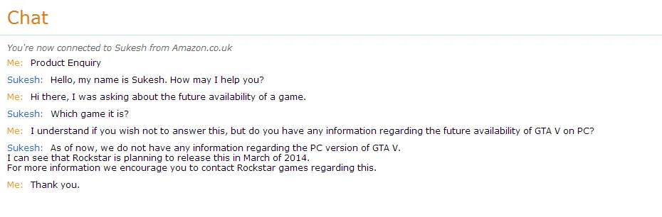 «Добро пожаловать в Amazon Chat. Меня зовут Фатима [...]. По нашей информации GTA V для ПК будет анонсирована 12/24 и, в соответствии с нашим источником, релиз игры состоится 03/12 в США и 03/14 в Германии»,