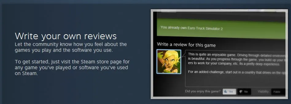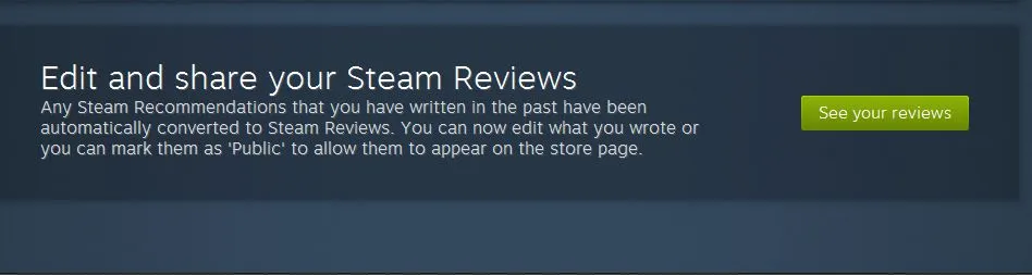 Любые Steam рекомендации, которые вы написали в прошлом автоматически преобразуются в Steam Отзывы. Теперь Вы можете редактировать, то что вы написали, или же, вы можете пометить их как "общественность", чтобы позволить им появляться на странице магазина.