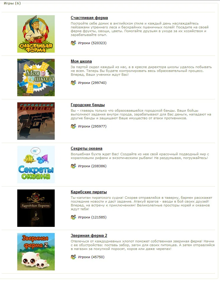 Пока посетителям доступны такие игры, как "Счастливая ферма", "Моя школа", "Городские банды", "Секреты океана" и "Карибские пираты". Число игроков в них варьируется от 45 до 200 тысяч.