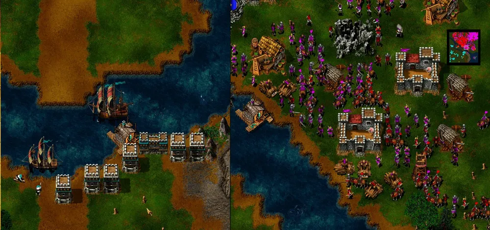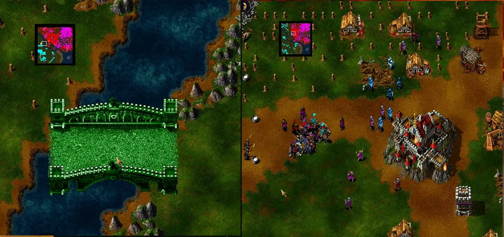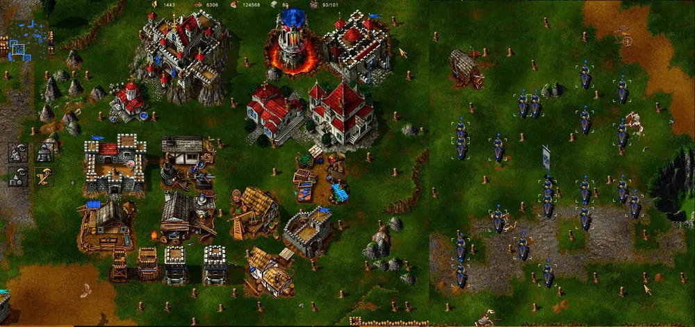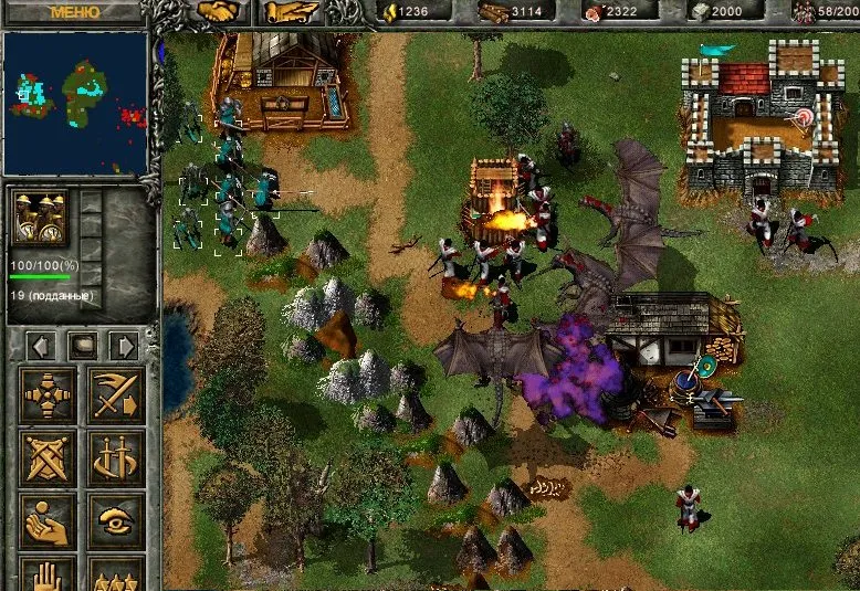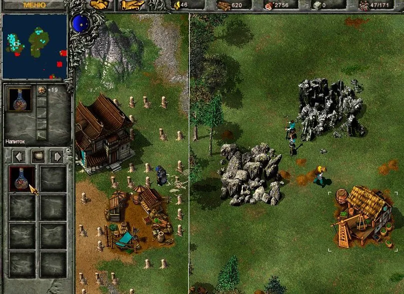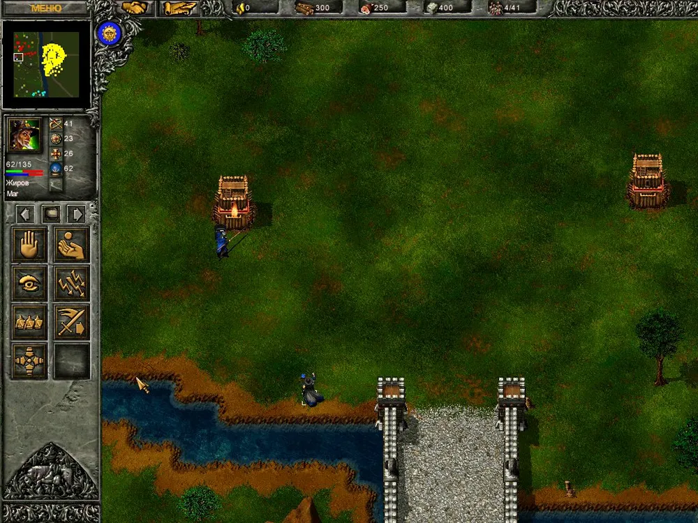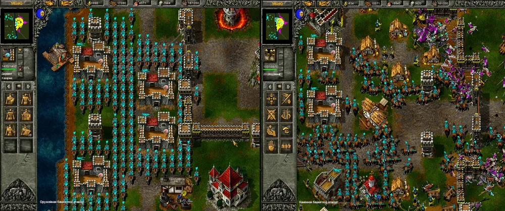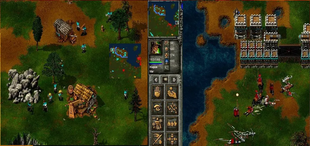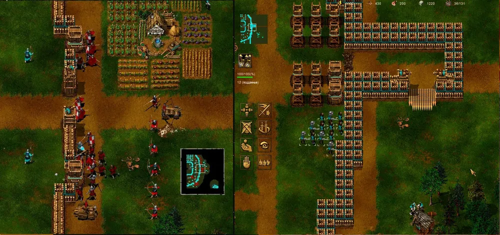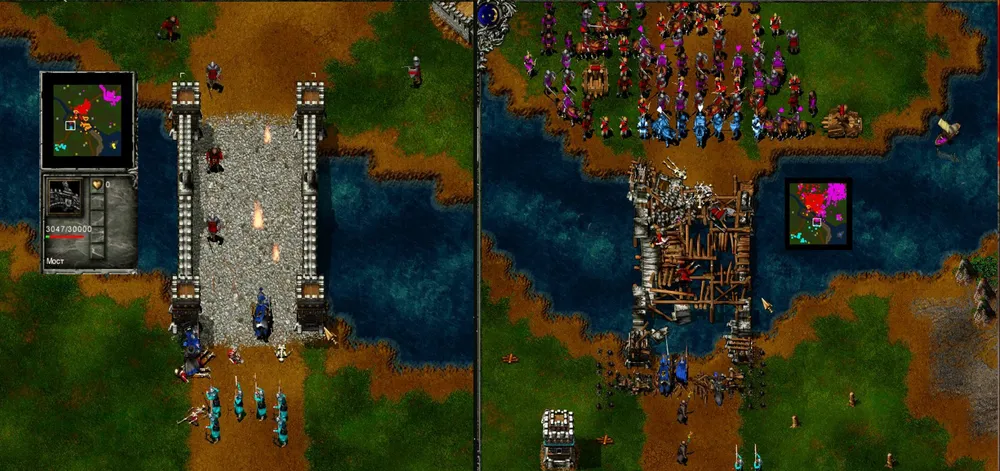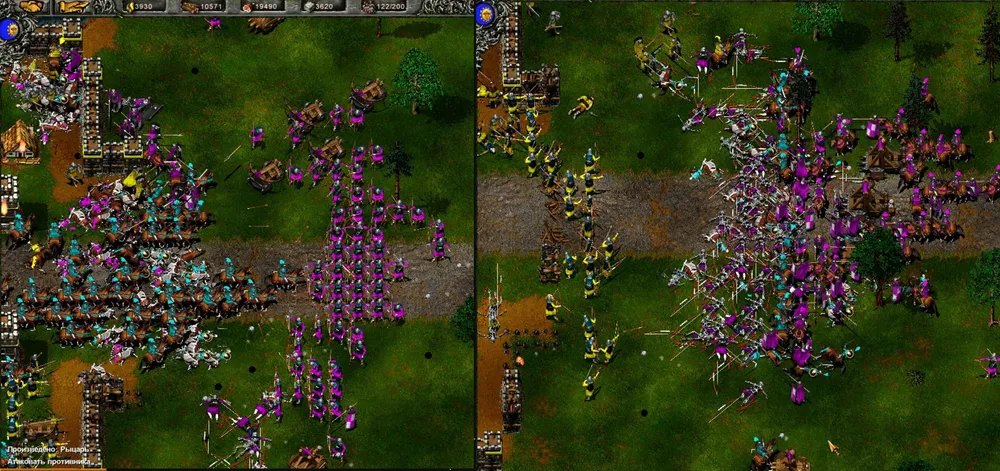 Ловим рыбу, разводим коров, добываем золото и рубим лес. Герои занимают позицию на крайнем восточном мосту: копейщик становится в оборону, а маг молнией бьёт по второй от края башне. Скорее всего, начнётся атака патруля, но пара героев справится. Башня рухнула, переходим мост и подвигаемся вдоль берега к краю карты, после чего герои атакуют первую башню. Рухнула и она? Пробираемся к замку и открываем охоту на вражеских крестьян, одновременно отправляя на помощь пятерых своих.
