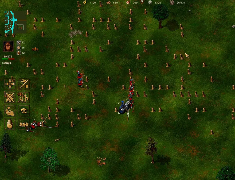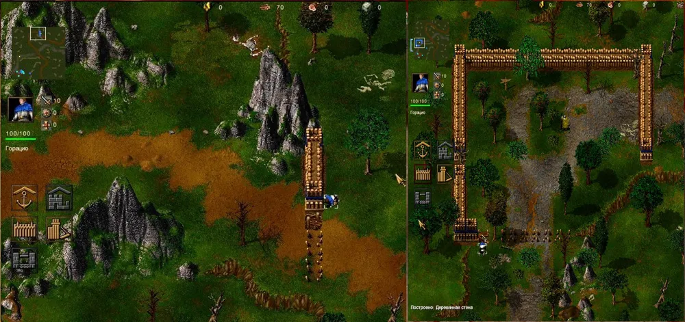 Усложняем задачу: Горацио добывает ещё больше дерева и окружает место появления вражеского отряда стеной с воротами, строит ещё одно чучело, для Спартака. Теперь у нас в отряде два героя восьмого уровня. Всё? Да ведь Горацио умеет строить ВСЕ здания – почему бы не использовать такую возможность?