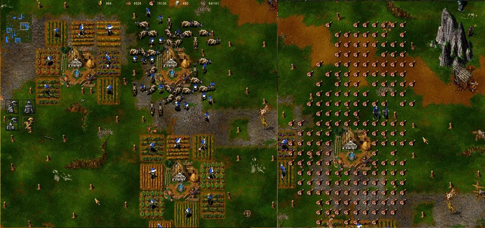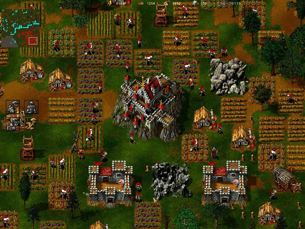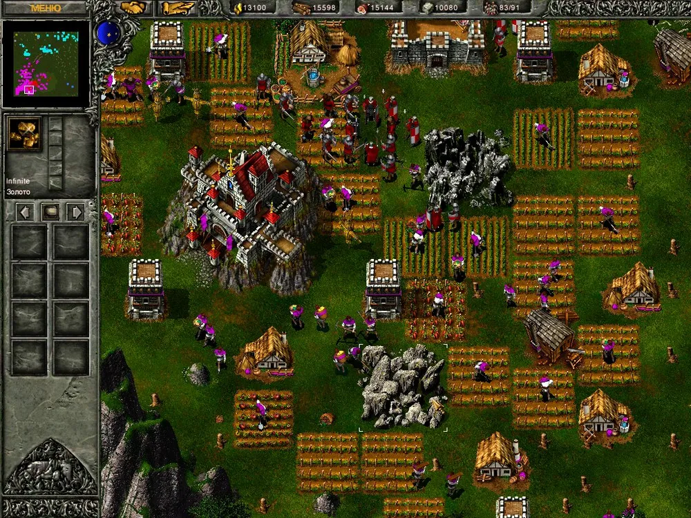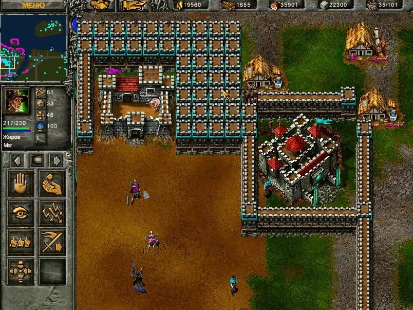 Рубим лес – вернее, рубит только герой – а кто говорил, что быть героем легко? Нарубив достаточное количество, строим ферму и вскапываем огород. «Накопав» 200 единиц овощей, Горацио возводит таверну и копает дальше. За час времени он добудет 3000 единиц еды, обменяет их в таверне на 300 золота, и мы приобретём возможность одомашнивания животных. Ещё триста пищи, и готово – есть первая корова. Долой огород! Герой становится дояром. Получив 600 единиц пищи, заводим ещё двух коров, и процесс выдаивания молока становится непрерывным. (Чтобы коровы не разбегались далеко, окружите ферму стеной.) За час герой получит 15000 единиц продуктов и обменяет их на 1500 камня, а столько же леса есть в запасе.