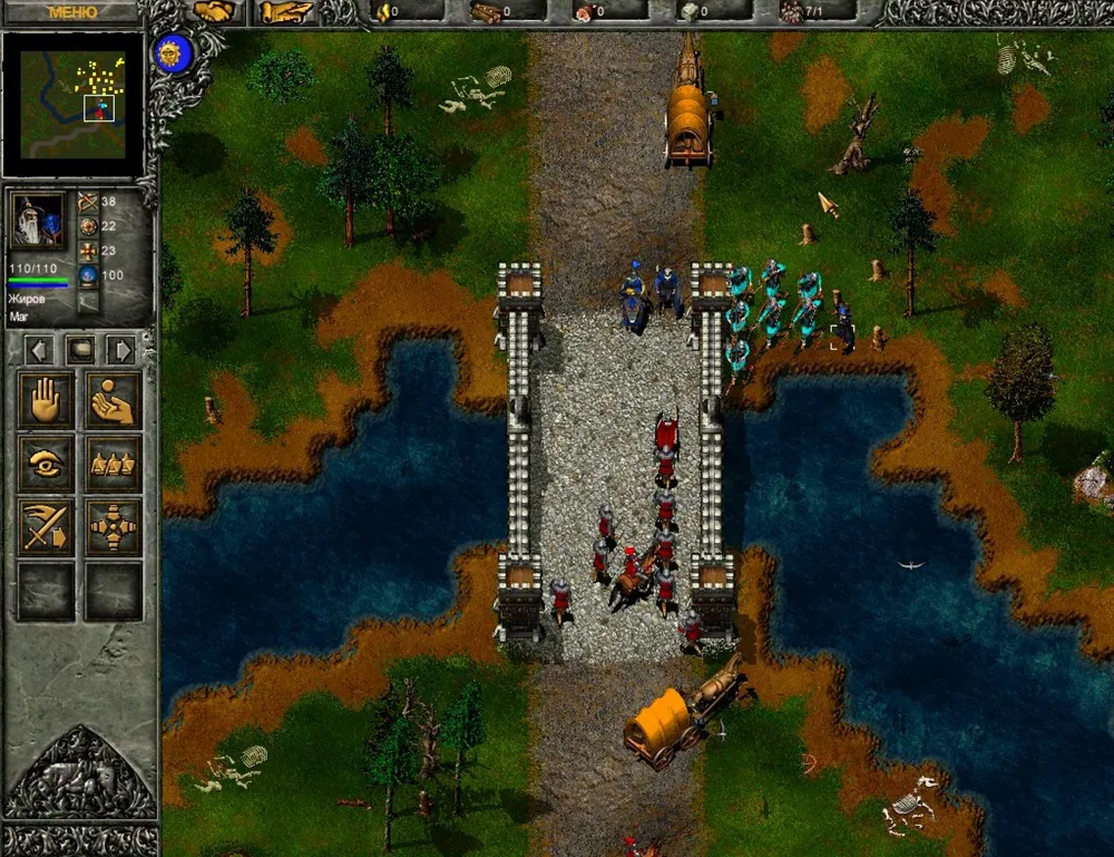 В принципе, эту миссию можно завершить и без участия супервоинов, но разговора с их предводителем всё равно не избежать. Ваш отряд появился на карте? Немедленно отправляем рыцарей на юг, через мосты, причём Горацио не двигается с места! Дело в том, что через несколько секунд после начала миссии в путь через мосты отправится длиннейшая вереница крестьян, которая невероятно замедлит продвижение ваших воинов, а значит – отодвинет время нанесения первого удара по врагу.