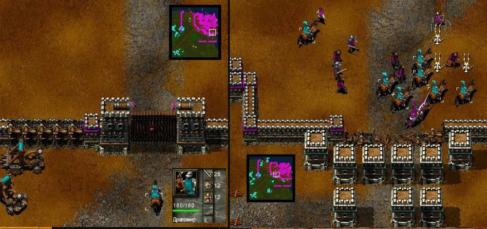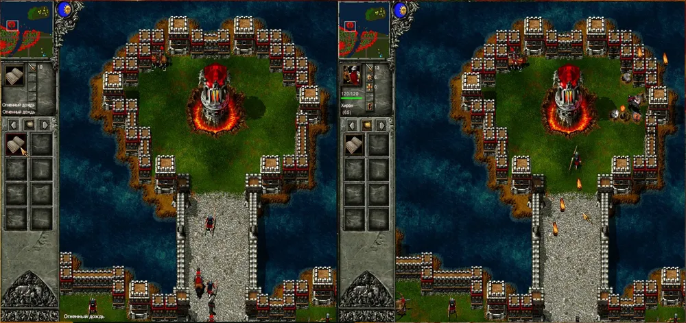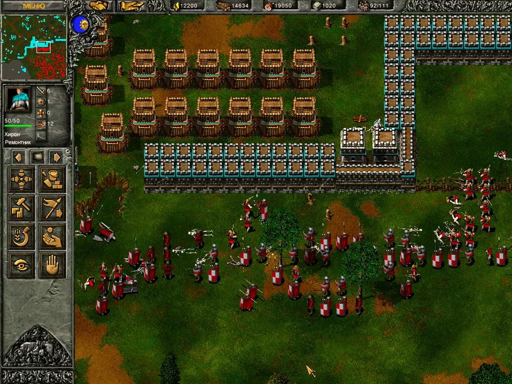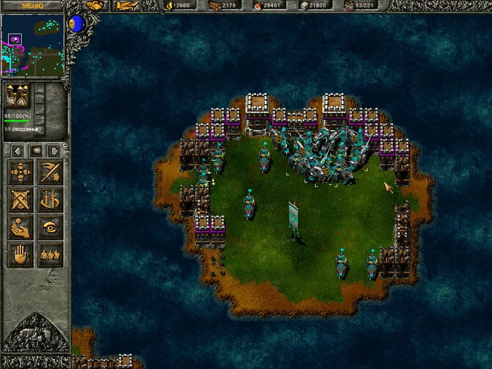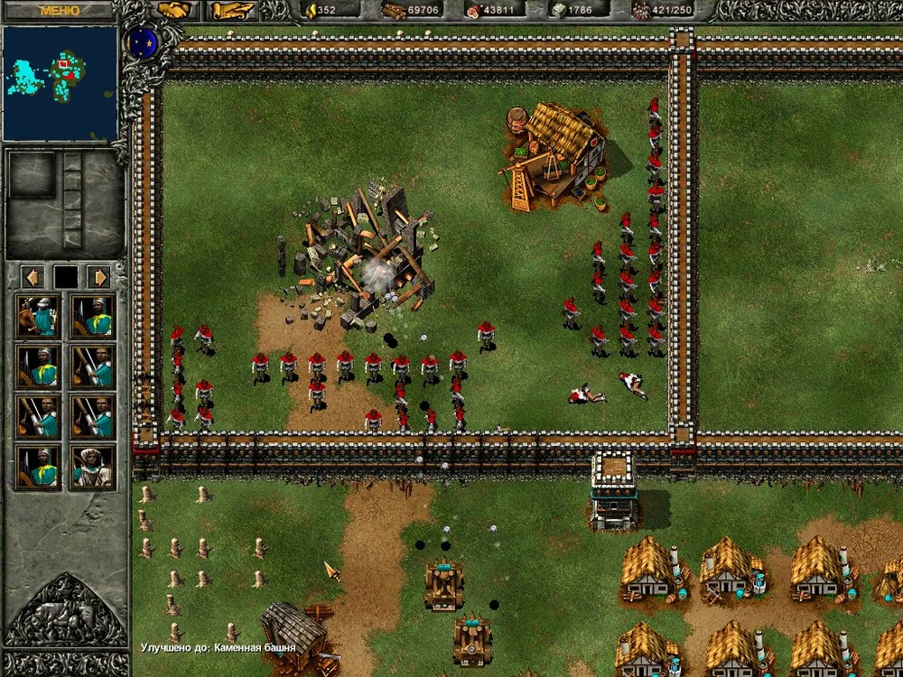 Более всего противник почему-то ненавидит крепостные стены, и не успокаивается, пока не снесёт их до основания. Причём стены атакуют не только пехотинцы, но и катапульты. Не надо объяснять, что происходит с пехотинцем, рубящим стену мечом (!), когда над его головой в ту же стену врубается здоровенное каменное ядро? Войско врага понесло изрядные потери! И осталось стоять на дороге – толпой. Неожиданно рядом с лучниками появился зачаток стены – рабочий, стоящий на острове, получил приказ на строительство. Град стрел, стена уничтожена, и тут в толпу лучников врезались ядра собственных тяжёлых катапульт. Дольше всех продержался маг: уничтожая кусочки стены (за это положен опыт, а как же!), он получил статус героя, но в конце концов всё равно рассыпался стеклянным крошевом.