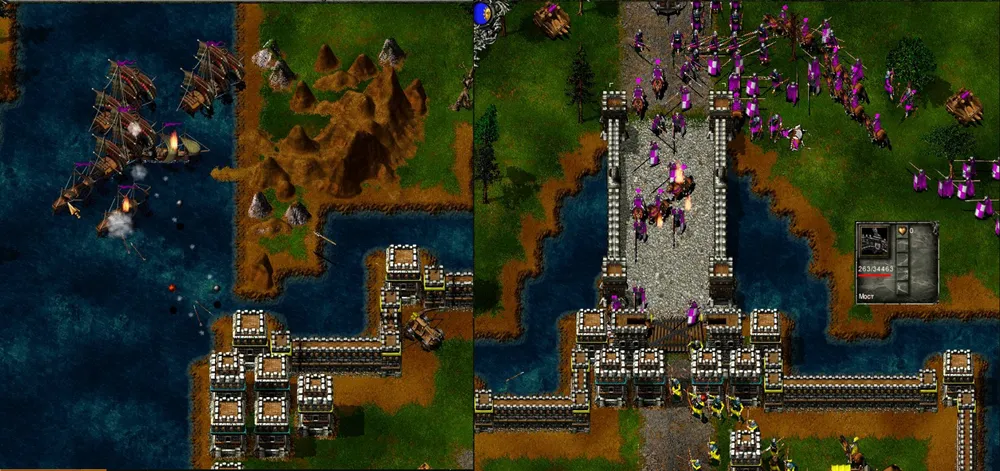 Враг пойдёт в атаку с трёх сторон (если считать флот – с четырёх, однако с таким «флотом» справятся пять башен), причём северная атака пойдёт через мост. Возводим у него две-три артиллерийские башни и отдаём приказ открыть огонь по мосту. К моменту появления неприятеля мост будет почти разрушен. Прекращаем огонь и ждём, пока вражеские войска заполнят мост. Десятка ядер будет достаточно, чтобы мост рухнул вместе с врагами.