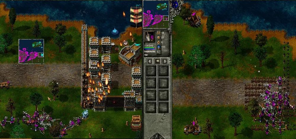 Выставив корабельный заслон, начинаем производство ронинов и самураев, задача которых: отбивать атаки врага. Горацио с рыцарями истребляет оставшихся на северо-востоке крестьян – один враг нейтрализован. Начинаем охоту на лесорубов Аку Джавы, попутно уничтожая все строения. Накопив достаточно сил для атаки, отправляем отряд к северным воротам крепости: разрушить казармы, мастерские, и при удаче – выбить ворота. Или сделать брешь в стене.