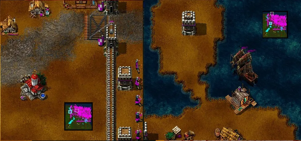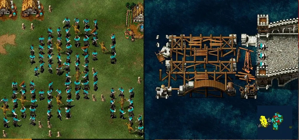 Второй способ: массово производим еду, добываем золото и рубим лес. Высадившиеся на другой берег крестьяне начинают крушить союзные здания, расчищая место для казарм.