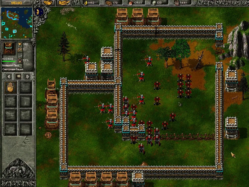 Причём стены надо возводить таким образом, чтобы все башни находились за ними. Добавляем к защитным постройкам Горацио три десятка своих и ждём появления врага – мало ему не покажется.