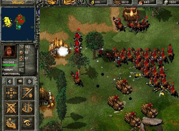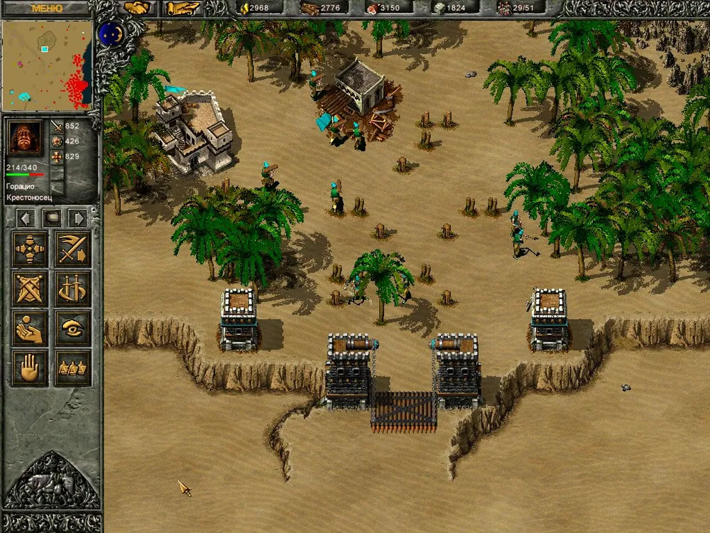 Крестоносец уже успел разрушить три ряда башен на ближайшем перешейке между озёрами и напал на первый вражеский замок. Противник ещё не успел отстроиться, солдат вокруг замка – мало, и Горацио с ходу выносит первую вражескую базу. Начало положено. Добравшиеся до перешейка крестьяне строят заставу и начинают рубить лес, расчищая место, а Жиров становится на их охрану.