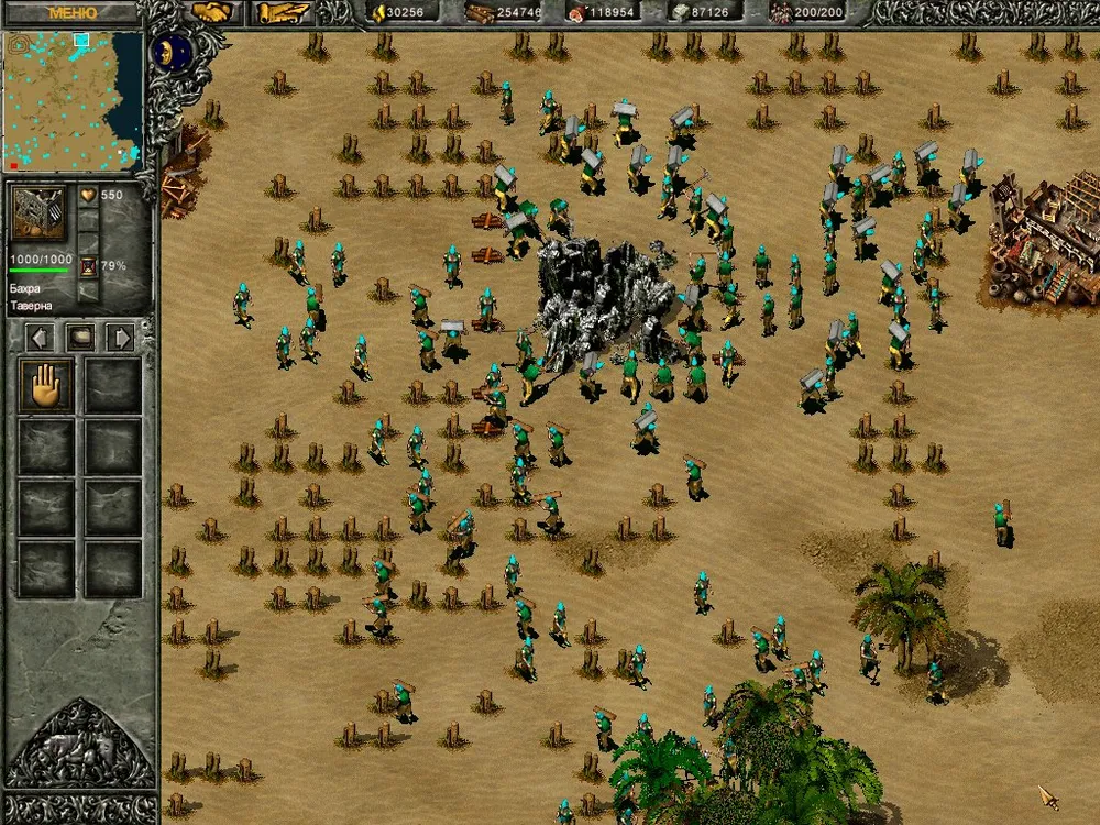Возводим вокруг бесконечного золота (все месторождения врага имеют бесконечный запас золота и камня) несколько хранилищ и начинаем усиленную добычу золота.