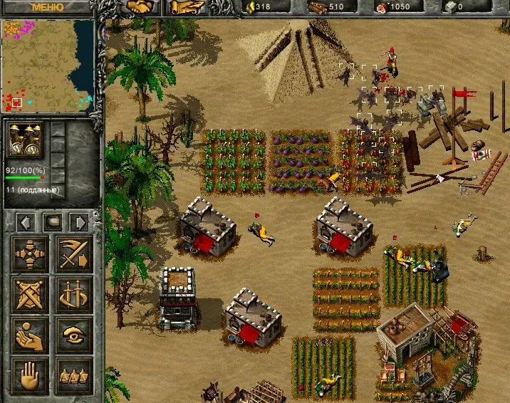 Крестьянин перейдёт под ваш контроль, только если к нему вплотную подойдёт воин (Жиров не в счёт!). Причём подходить нужно к каждому крестьянину и к каждой корове. И тотчас уводить их в сторону – враг близко. Отправьте одного воина к западной пристани, иначе враг захватит её. Не пропустите высадку нескольких восточных крестьян на ваш остров. Идеальный вариант: до их визита построить торговую гильдию и подкупить врага; это позволить возводить восточные строения.