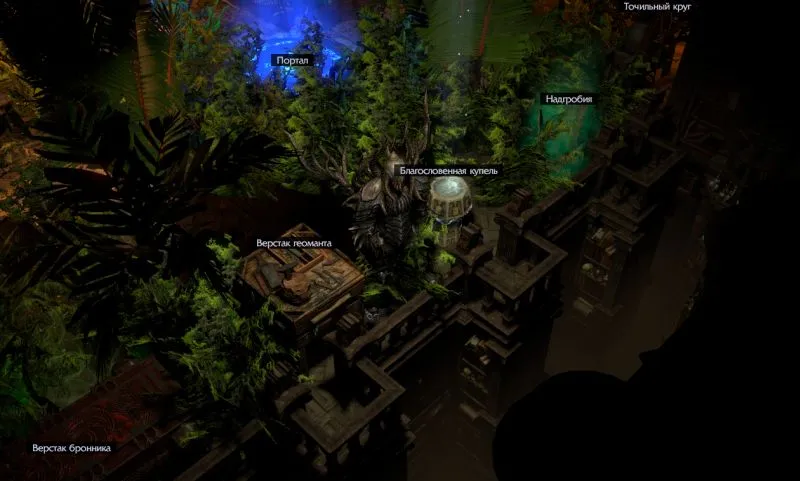 От входа в убежище расходятся две мощеные дороги петляющие сквозь лес деревьев и статуй былых героев. Вечная стража глядит недоверчиво на вошедших гостей. Ветер играет в кронах болотного Хондодендрона, кусты Аконита растут вперемешку с Клешевицей и Дурман травой. Терпкий аромат наполняет воздух, приглашая вздремнуть. Не сходи с тропы, ведь безмятежный лес обманчив.