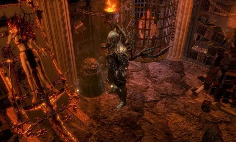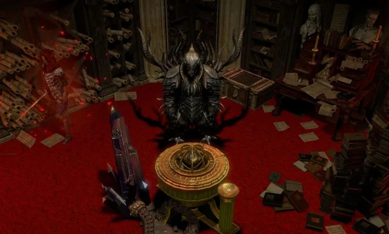 Мастер странствий выбирает карты у своего шкафа. От внимательного зрителя не ускользнет, что карты не только отсортированы по уровням, но и сложены особым образом, что позволяет хранить их пачками. Уверен, что редкий изгнанник отказался бы от подобного стеллажа.