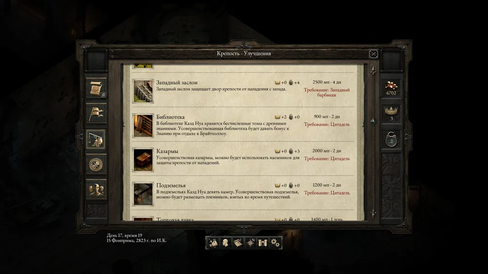 С учётом того, что в нашем замке возведён один лишь восточный барбикан, а цитадель все еще в процессе строительства, нет никакого смысла оборонять Каэд Нуа. Ущерб от нападения агентов составил целых 200 пандов. Даже интересно, чем этот ущерб был вызван: они исписали стены или помяли траву во дворе? В дальнейшем, конечно, придётся отвлекаться на подобные события, если они будут иметь место - нападения могут повредить здания.