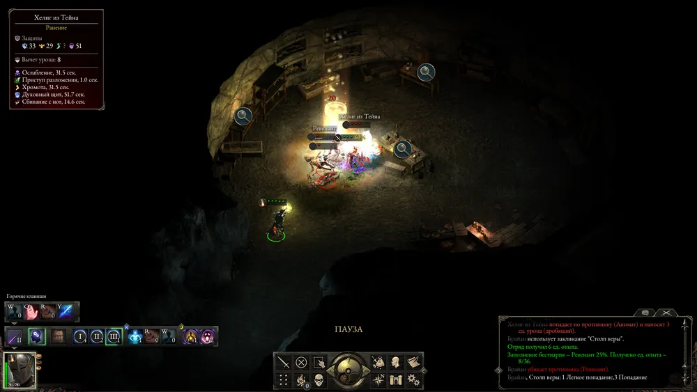 У ослабленного Хелига из Тейна 29 единиц стойкости, базовая точность нашего священника - 41 единица. Модификатор на заклинании - 15 единиц. Превышение суммарной точности сбивающего эффекта столпа составляет 27 единиц, что исключает вероятность промаха.