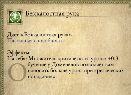 Для продвижения сюжета нам придётся примкнуть к одной из сторон - за это, после выполнения финального задания, персонаж получит новое пассивное умение. Дюжины повышают эффективность в бою при совместной атаке одной цели с союзником. Крайне сомнительно для соло-прохождения. Рыцари Горна увеличат ваш вычет урона, что является неплохим приобретением: снижение урона никогда не бывает лишним. Дом Доменелов увеличивает мультипликатор критических ударов (в том числе и заклинаний) на 0.3 - сильнейший бонус из представленных.