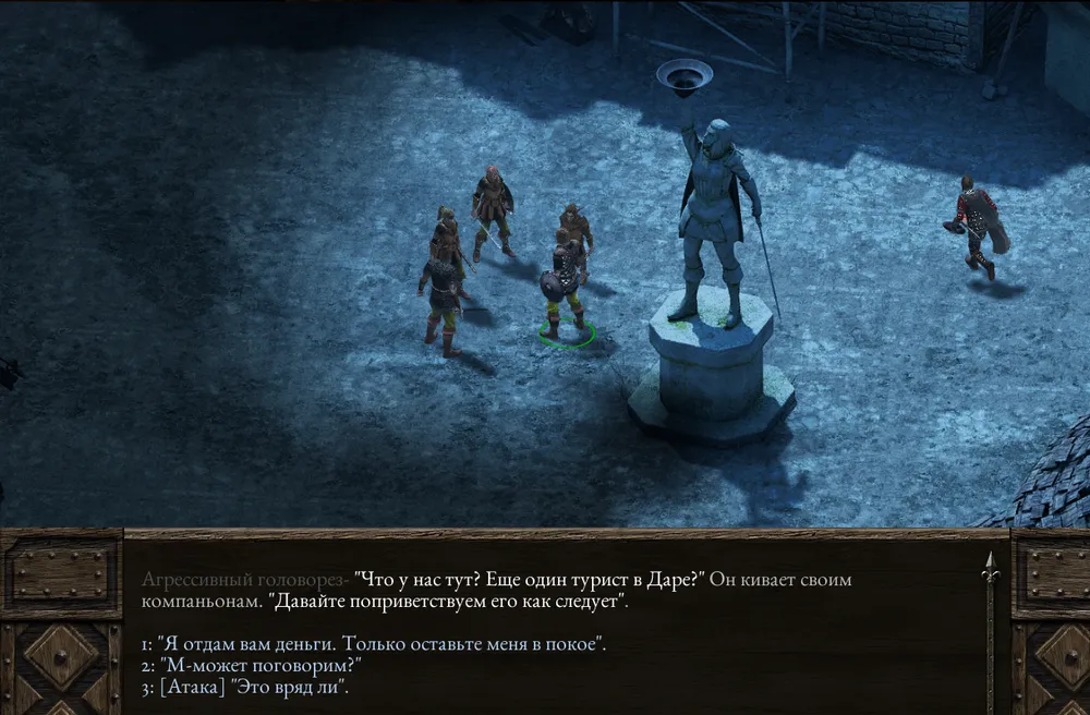 На выходе из борделя у статуи Магран группа головорезов, очевидно, приняла нас за клиента Мэй.