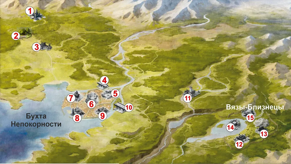 1 – Силант Лиис. 2 – Вейлвуд. 3 – Позолоченная Долина. 4 – мост Мадмр. 5 – Копперлейн. 6 – Первые Огни. 7 – Заветный Холм. 8 – Дар Ондры. 9 – Брэкенбури. 10 – мост Эдельван. 11 – деревня Дирфорд. 12 – Хартсонг. 13 – Элмрич. 14 – Погребальный остров. 15 – Олдсонг.