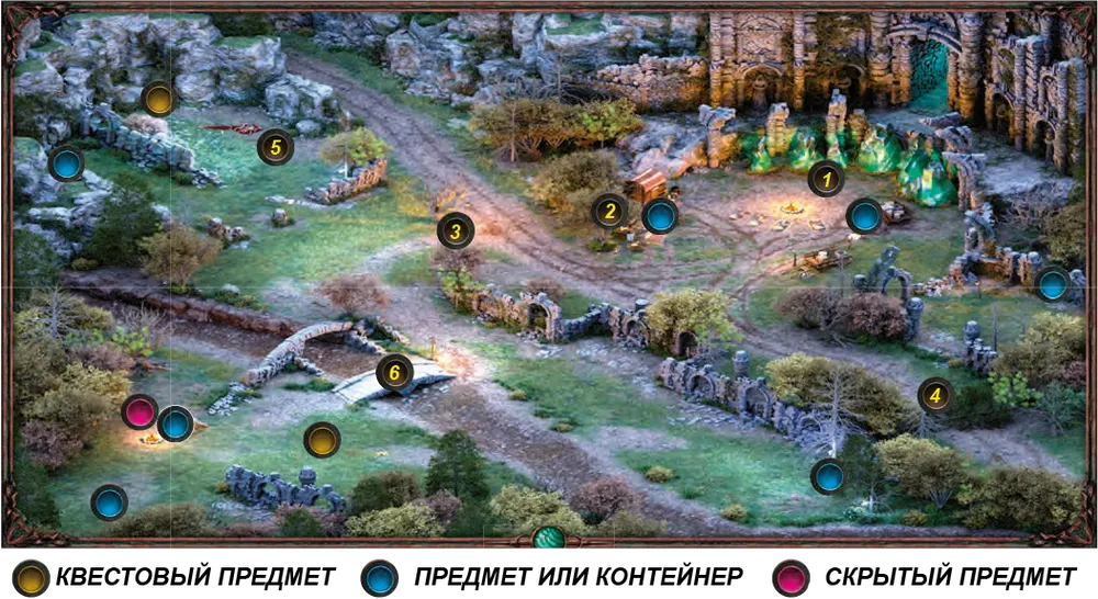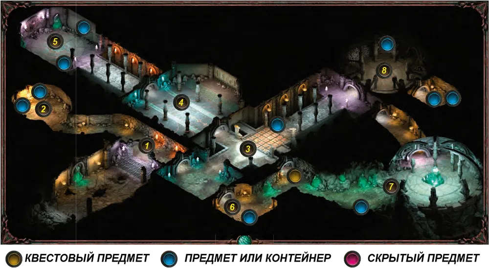 1 – старт. 2 – лагерь. 3 – ловушки. 4 – комната с колоннами. 5 – сокровищница. 6 – голодный ксаурип. 7 – треснутая стена. 8 – зал с пиковыми пауками.