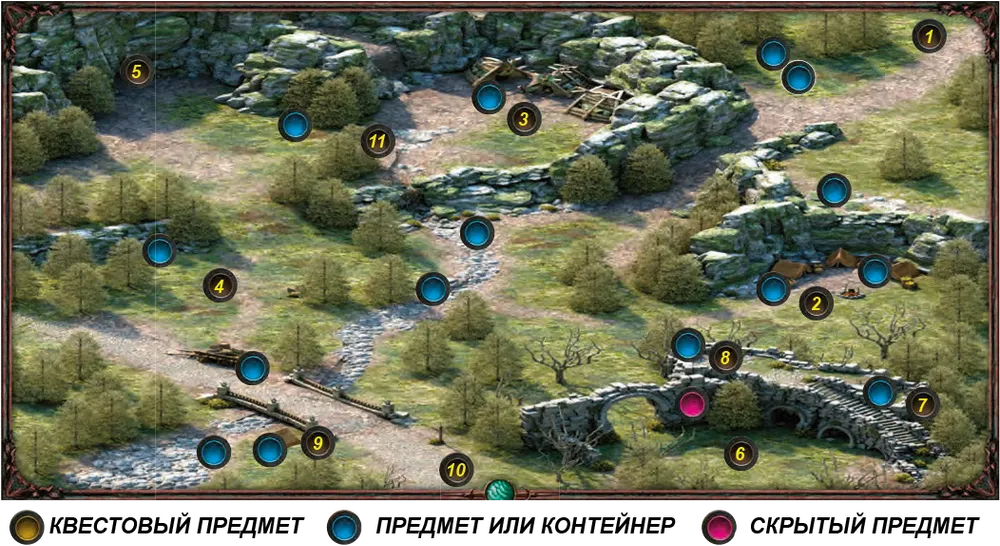 1 – выход к Силант Лиис. 2 – лагерь бандитов. 3 – лагерь ксаурипов. 4 – сломанная телега. 5 – медвежья пещера. 6 – стая волков. 7 – обрушившаяся лестница. 8 – мертвое тело. 9 – Нонтон. 10 – выход из локации. 11 – вождь Иклак (охота за головами).