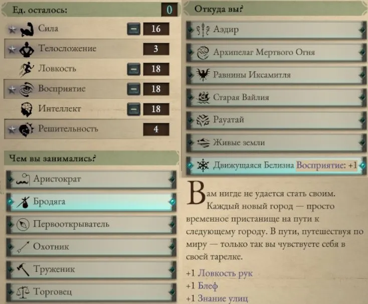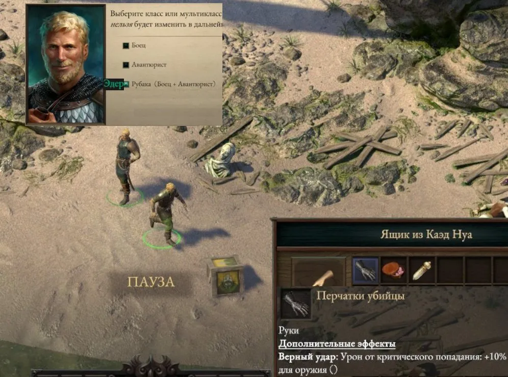 Затем удивило предложение импортировать сохранение игры из первой части; было бы наивно предполагать, что это позволит сохранить уровни персонажа и его экипировку, поэтому я начал создавать игру «с нуля». Ого, есть мультикласс?! Наконец-то! (Увы – возможности дуал-классирования персонажа нет…) Конечно, боец и авантюрист-ассасин (это было ошибкой). Характеристики: такие же, как и в предыдущей части игры. Оружие – кинжал и меч, как наиболее часто встречающиеся.
