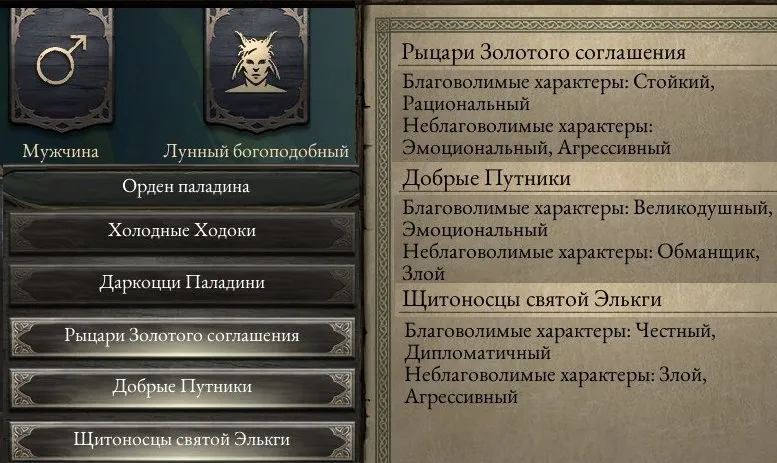 Лунный Богоподобный – чтобы автоматически повышал выносливость всем соратникам. А вот какой орден выбрать? Дело в том, что за выполнение условий характера паладину обещано повышение защитных характеристик… Увы: данное условие, по-видимому, касается только паладина-героя; несмотря на честные дипломатичные поступки отряда Аджантис характеристик не повысил…