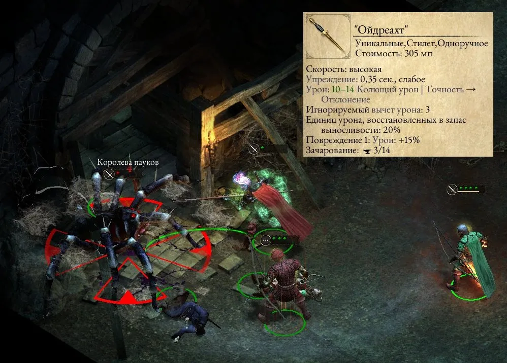 В подвале замка уничтожаем королеву пауков и находим на её трупе первое приличное оружие, стилет «Ойдреахт».